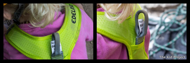 Tie-in loop on the back...For years now my husband and I have been clipping an additional rope onto the backs of our kids as they climb. They are still securely tied into the top rope but tow a rope up with them as well. Why? Well, climb with a young kid once and here are somethings you might experience:
