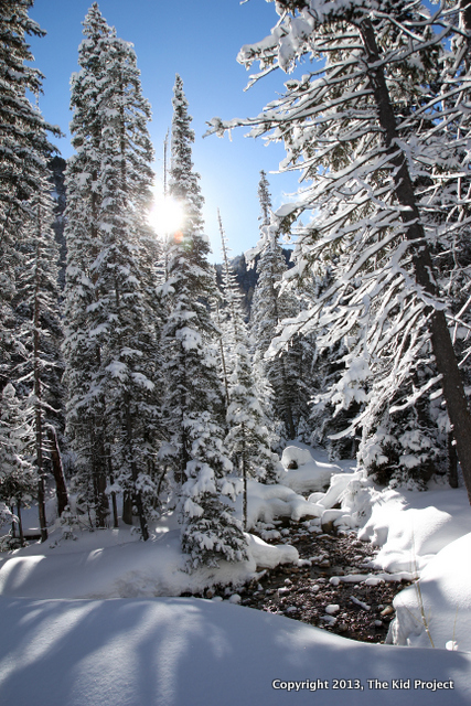 Ascending Donut Falls in the WinterDonut Falls is a fantastic easy trail during all four seasons, but it is slightly different in the winter. Mainly because the access road is closed further down, making the round-trip distance slightly longer than in summer. Follow the road to the south. Shortly after passing some cute cabins and houses, the road will become trail. Because of the popularity of this trail, it will most likely be packed trail, unless you are breaking trail after a big storm. The trail winds through beautiful forest, across small creeks, and under towering summits. As you near the falls, the trail will drop into a drainage to the left. Trail may become icy and everyone should hike with care. You can ascend the falls up to the “Donut” and watch the water cascade through the hole. If you want to take a snack break, I’d suggest heading back down the trail until you find some sun, as the falls is usually shaded and cooler. With three kids ages 3-7, it took us approx. 3-4 hours to complete this.