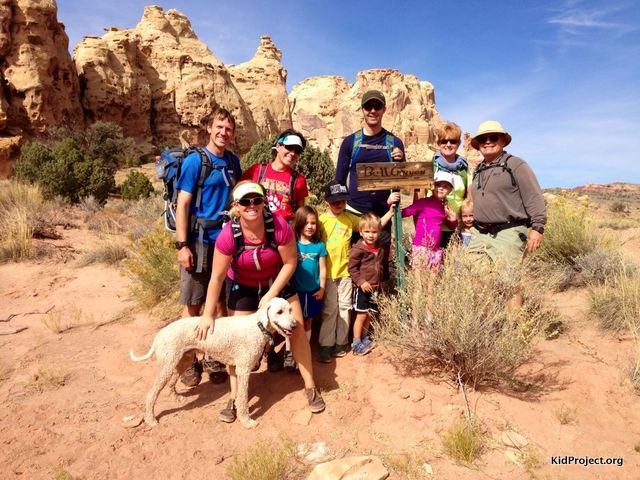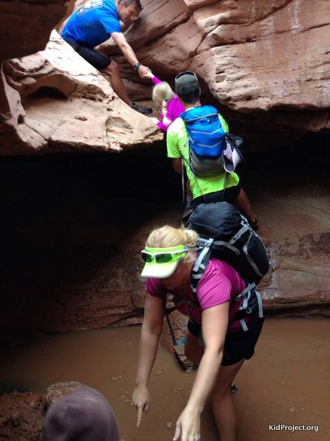 Passing up the kids so they couldn't get wet, conga line style! Photo Credit: Kelly KonopaAs you emerge out of Little Wild Horse Canyon you end up on a well established trail that turns into a jeeping road for a few miles. We climbed for a mile or so, enjoying fantastic desert views before heading down into Bell Canyon. Bell Canyon seems tame in comparison to what we’d already done! There are a few obstacles that took some scrambling skills to overcome, but nothing to worry about.