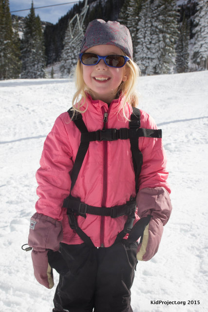 We are eeking out of the bunny-hill years but honestly the most questions we receive regarding teaching kids to ski is about how and when to teach your young kids. We started all our kids when they were 2 years old, something I was comfortable with, having also been taught to ski when I was two. But “how” is the difficult part. While we hardly used a ski harness with our oldest, the younger kids used one many times, mostly because they 1. wanted to be with their older siblings and 2. we were loosing patience with the host of other approaches to teaching we were using. For other ways we helped teach our toddlers to ski check out this post: Five Positions for Teaching your Toddler to Ski