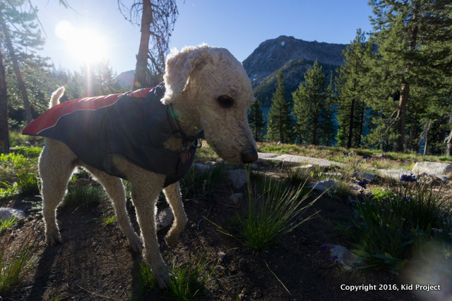 Kai wasn't so sure about his dog jacket but his short haircut necessitated it.Today was the best day, I knew it even before we woke up. In terms of quality, this segment of the trail had the least mileage (roughly 5 miles) and the best scenery when we make it over the pass and look down on Twin Lakes. But the walk around Toxaway is steller as well! Don’t hurry onto the next camp! Our day started immediately with amazing scenery.