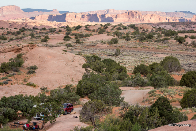 Sandflats is open to camping year round and has roughly 9 camping loops with numerous sites within each loop [roughly 124 sites total]. Most sites, except the group sites, are on a first-come-first-serve basis. Each site has a fire ring and picnic table, with a vault outhouse nearby. As for amenities, that is it! Many sites are certainly big enough for RVs and camper trailers. Bring your own water and if you have an RV/camper, make sure the batteries are fully charged! But you can expect to wake each morning to an orange and purple sunrise over the beautiful slickrock and canyons surrounding you. You are far enough away [2 miles] from Moab, so the stars are spectacular at night! Our kids loved digging, playing, rolling in the soft sands around camp, or riding their bikes on the rock. My boy [maybe all of us, really] even got a kick out of watching the jeeps crawl up the rocks [we even had to give the Xtera a try too]!