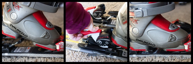 1. Get those boots on and walk! For the youngsters, ski boots are thrilling or terrifying. They are big, heavy, and hard. For those of us with toddlers who are just learning to walk on their own two feet, adding boots is hard enough. Much less skis too. Make this fun! Let them play with the buckles and walk around the living room. My son likes to play Iron Man with them on… he was thrilled when his boots this year were red, “Just like Iron Man’s,” he said! 2. Teach them how to get in and out of their bindings.